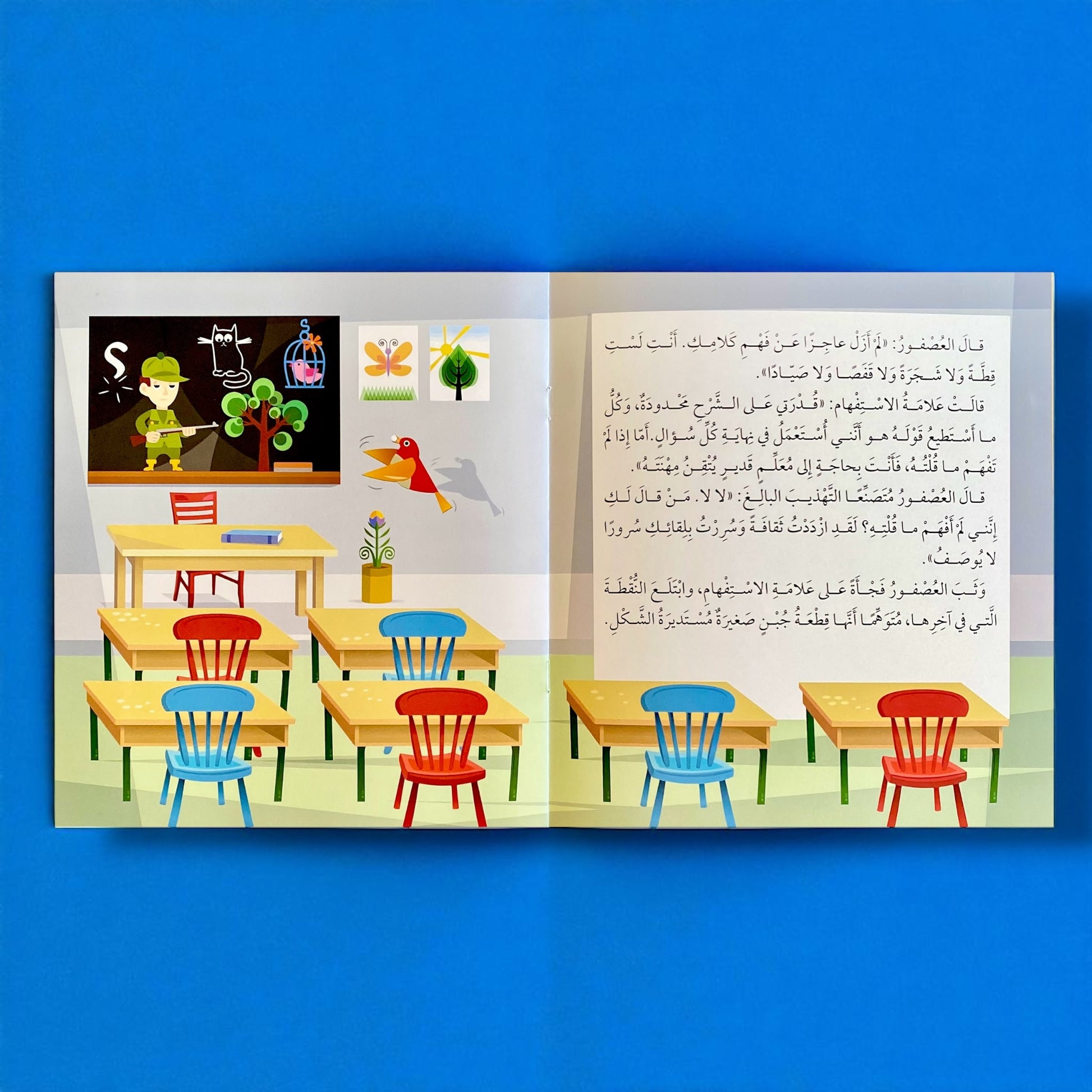 تخوض القصة حوارًا رمزيًا بين العصفور وعلامات الترقيم في اللغة العربية (علامة الاستفهام وعلامة التعجب)، وتوضح دورها في الجمل بطريقة مبسطة ومحببة للأطفال.